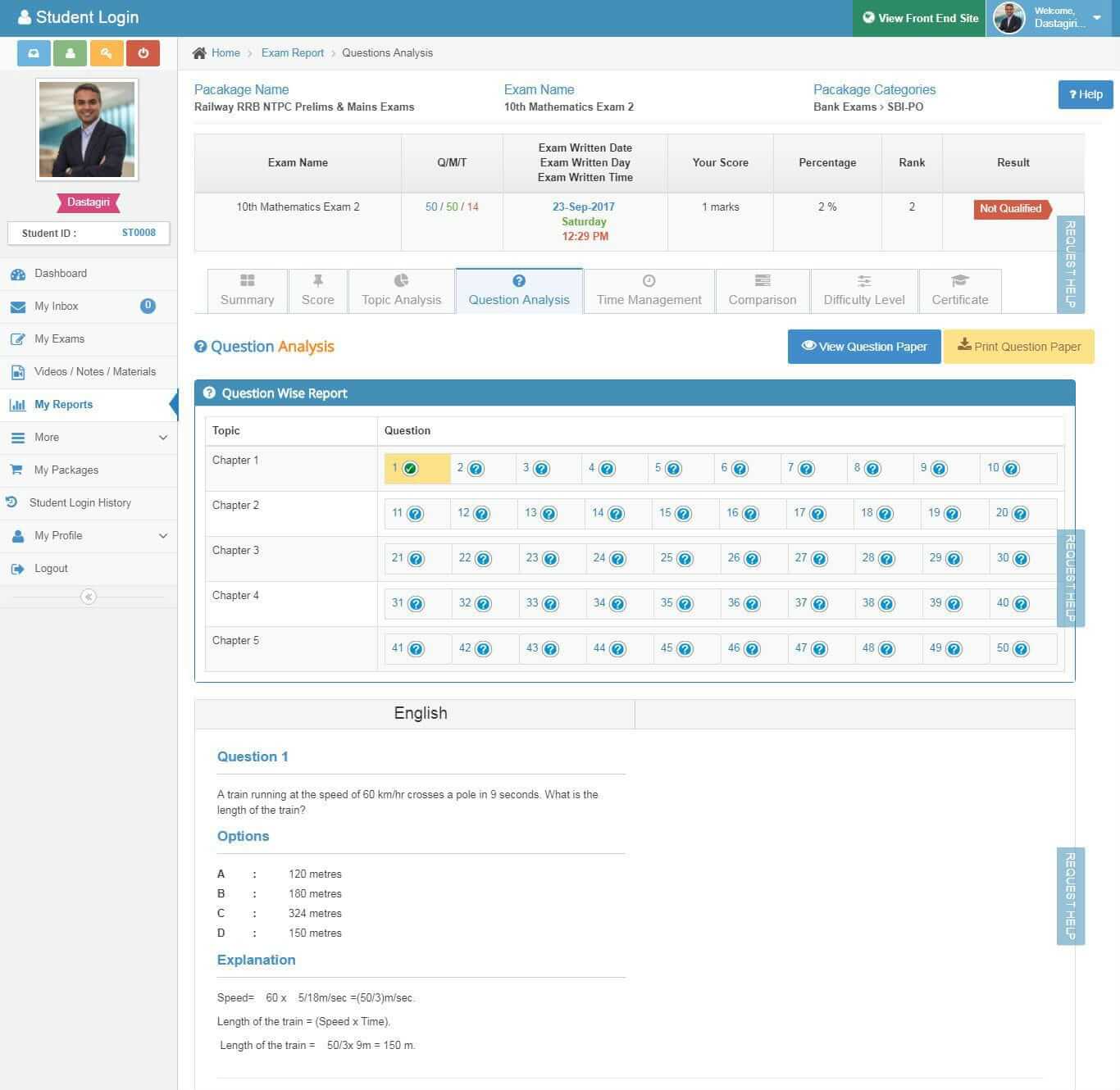 - Question Analysis: Question-wise report, Question Details, Question& Options analysis
